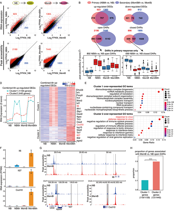 为了研究这群细胞在形成过程中的表观遗传信息改变及其对MemB细胞功能的贡献,侯百东研究组与朱冰研究组合作,通过RNA-seq、ATAC-seq等方法,分析体内抗原再免疫来评估记忆B细胞的功能。研究发现在二次反应中MemB受到转录增强的基因比例升高,且与静息MemB中染色质可及性的增加有关,表明表观遗传学变化可能启动这些基因的表达。且Qβ-VLP诱导的二次反应MemB相较于普通蛋白抗原特异性富集了更多病毒反应相关基因,其中大多数基因与先天免疫信号传导相关,这种增强的先天免疫反应可能保护病毒特异性记忆B细胞不被破坏。