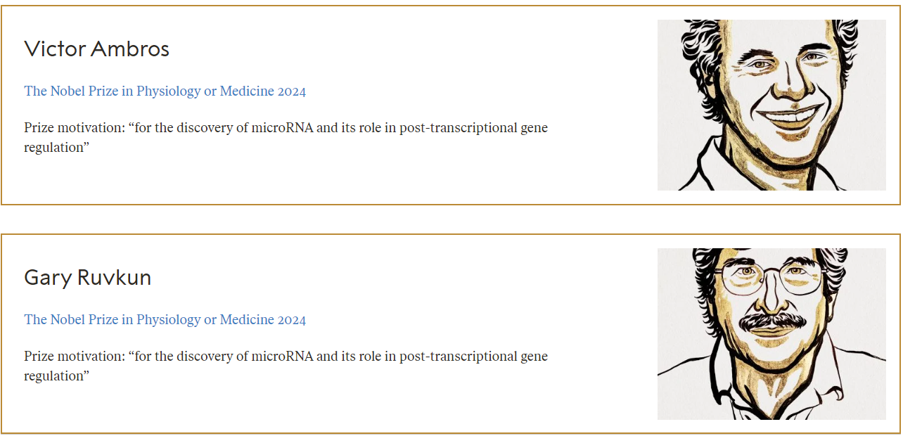 北京时间2024年10月7日下午5点30分许,2024年诺贝尔生理学或医学奖揭晓。Victor Ambros及Gary Ruvkun获奖,以表彰“发现microRNA及其在转录后基因调控中的作用”的重要贡献。