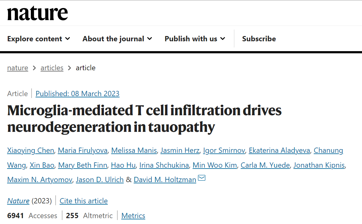1. Xiaoying Chen. et al. Microglia-mediated T cell infiltration drives neurodegeneration in tauopathy. Nature. 2023 Mar 8. doi: 10.1038/s41586-023-05788-0.